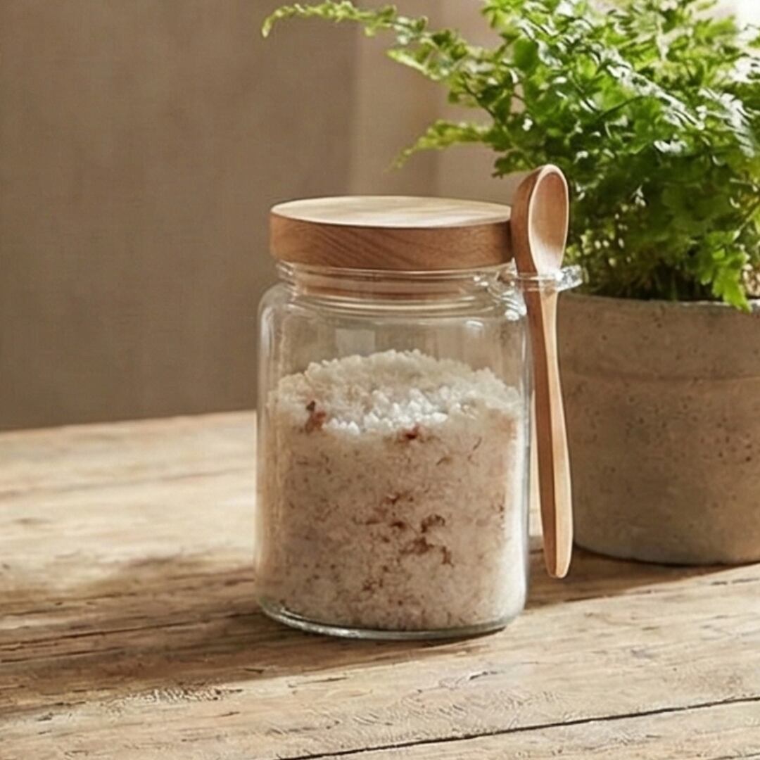 ナチュラルな統一感: 木肌の美しい蓋とスプーンが、無機質になりがちなキッチンに柔らかな彩りを添えます。
